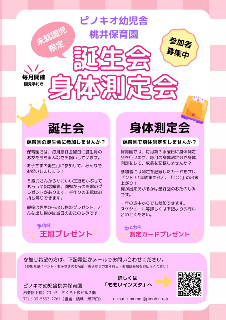 ピノキオ幼児舎桃井保育園では、地域の未就園のお子さまを対象とした誕生会と身体測定会を毎月開催しています。