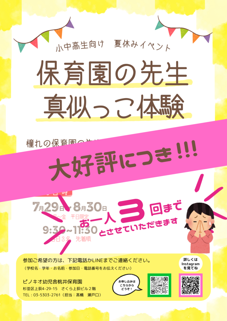 ピノキオ幼児舎 桃井保育園 受付時間(10:00~17:00) 担当:髙橋・瀬戸口