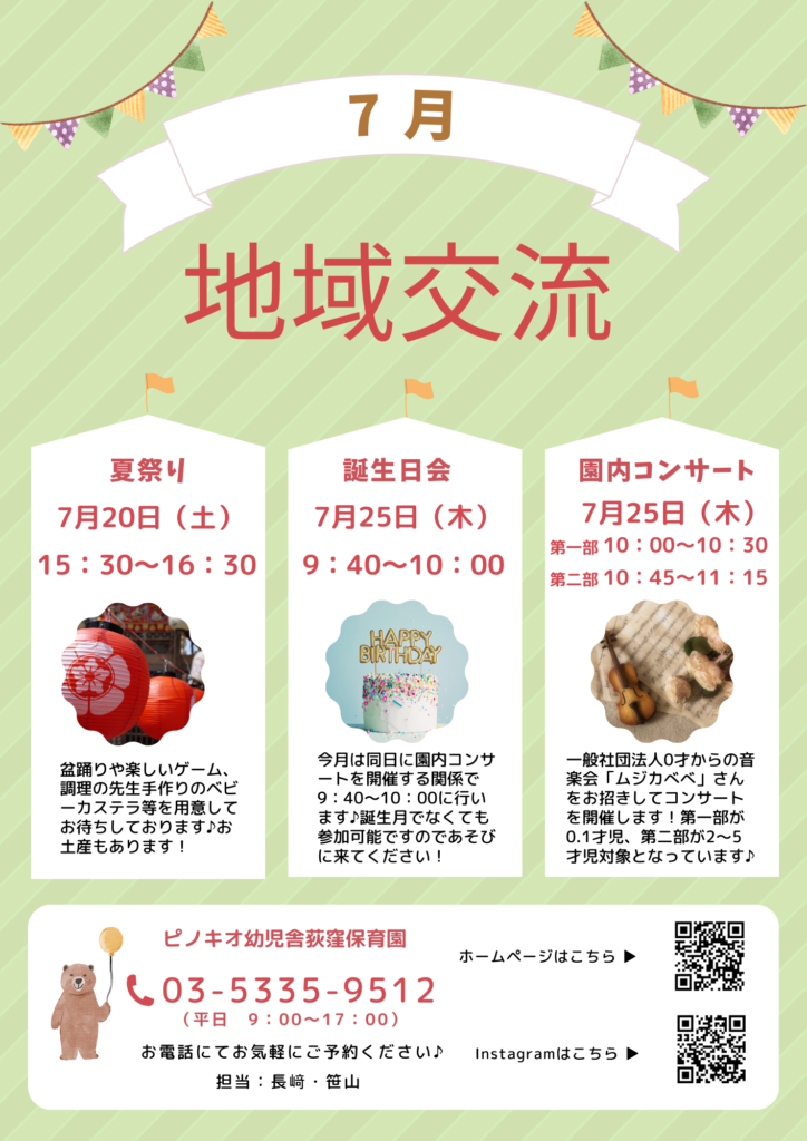 荻窪保育園 2024.07.03 7月の地域交流のお知らせ 地域交流 7月地域交流ダウンロード こんにちは♪ 7月の地域交流のお知らせです! 7月は、夏祭り・誕生日会・園内コンサートと盛りだくさん♪ 職員一同、皆様のご参加を楽しみにお待ちしております! お気軽にご参加ください! ご予約はお電話にてお願いいたします♪ (※定員になりましたらご予約を締め切らせていただきますのでどうぞお早めに!) 03-5335-9512(平日 9:00~17:00) 担当:長﨑・笹山