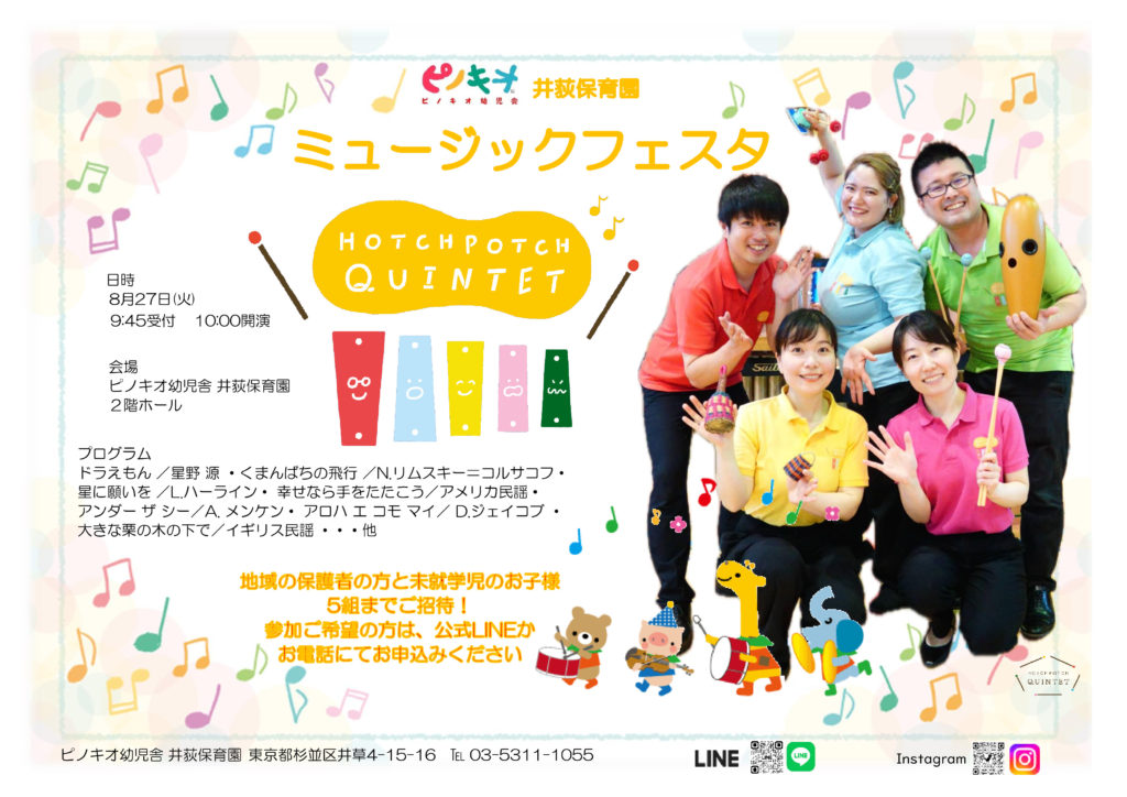 ピノキオ幼児舎井荻保育園のホールへお招きして、ミュージックフェスタを開催します。