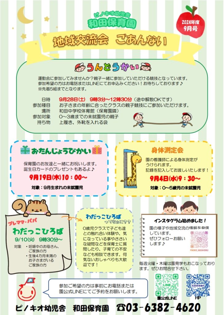 和田保育園 2024.08.22 9月 地域交流のお知らせ 地域交流 楽しいイベントが盛りだくさんです!参加お待ちしております☺ 【お申込み方法】お電話またはLINEにてお申し込みください!TEL:03-6382-4620 担当:山本・石﨑