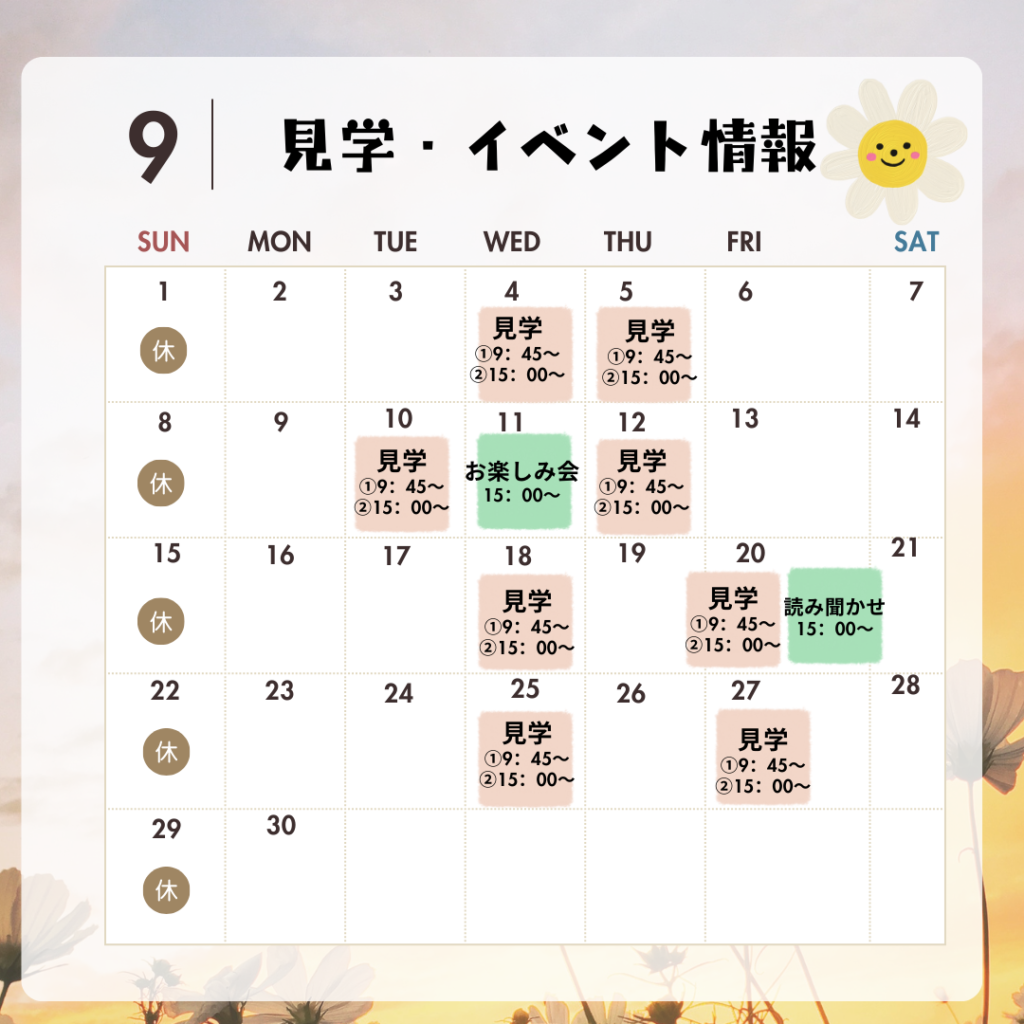 月島園 2024.09.04 園見学・イベントのご案内 園見学行事・イベント 9月の園見学・イベントの日程が決まりました! ご来園を職員一同お待ちしております♪ ご予約はお電話または公式LINEからお願いいたします。