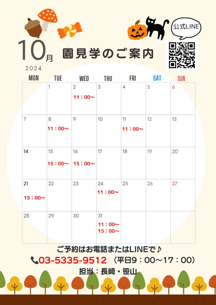 荻窪保育園 2024.09.26 10月 園見学について #荻窪保育園 園見学 秋の気配を感じる季節となりました。 10月の園見学のスケジュールが決まりましたのでお知らせします! ご予約はお電話または公式ラインからお願いいたします♪ 10月園見学ダウンロード