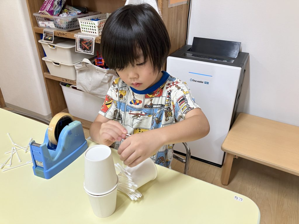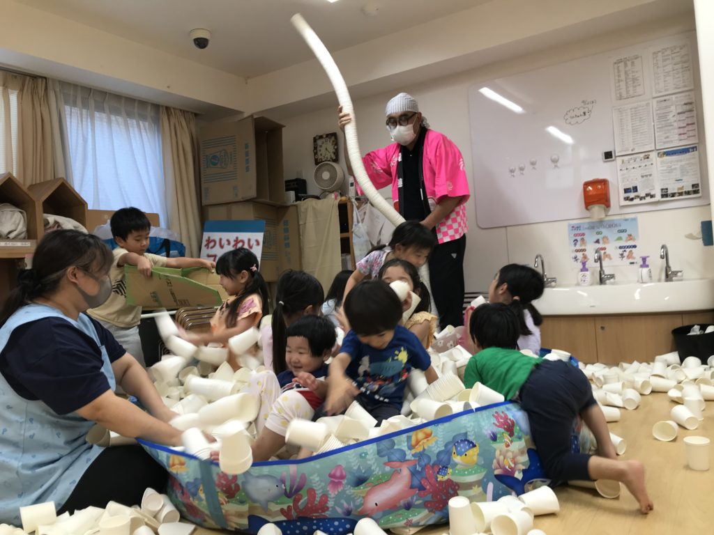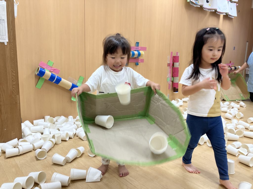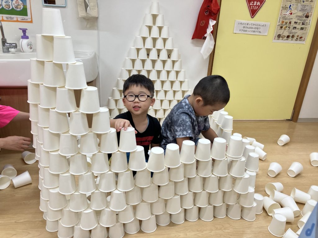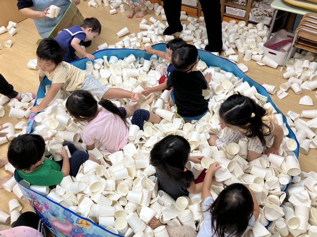 今年は各クラスで夏に栽培したヒマワリを作ったり、2000個の紙コップを使って”こうさく“”じっくり” “わいわい” それぞれの感性で遊ぶ体験を行いました。