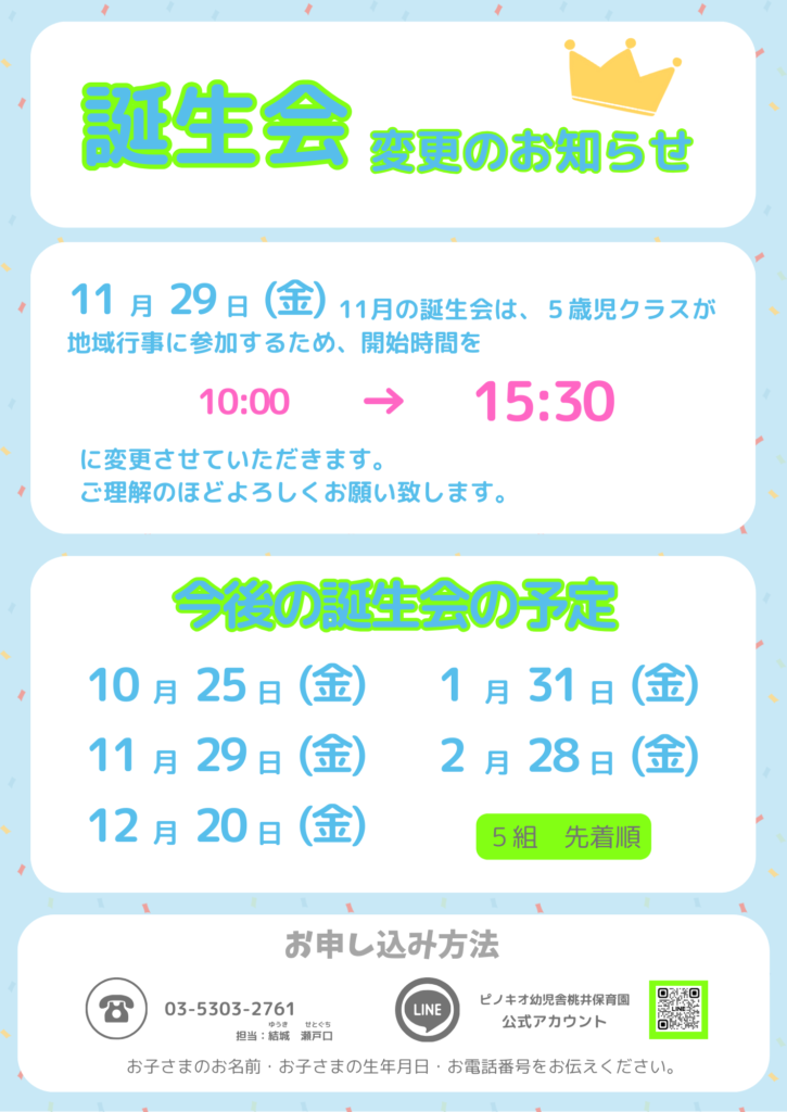 11月の誕生会の開始時刻が変更になりました。参加をご検討中の方は、ご確認をお願い致します。