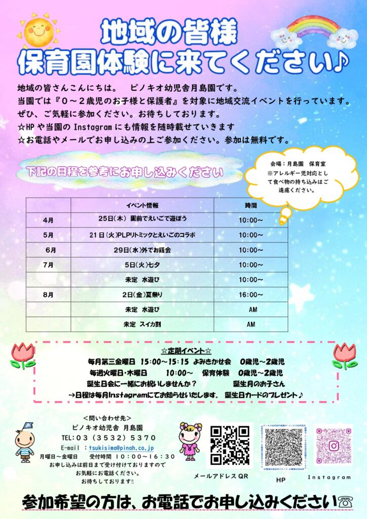 月島園 2024.05.10 定期イベント 地域交流行事・イベント 毎月第三金曜日15:00~15:15 地域の方による読み聞かせ会毎週火曜日・木曜日10:00~保育体験毎月誕生日会 日程はInstagramをご覧ください。 対象年齢:0歳児から2歳児(当日は保護者様と一緒にご来園ください) 予約はお電話または、メールにて随時受付中!当日の参加もお待ちしています!ピノキオ幼児舎月島園 ☎03-3532-5370 地域交流のご案内ダウンロード