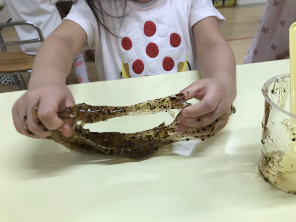 保育者が「お茶でなにをしたい?」と問いかけると「スライム!」と声が上がり茶葉でスライムを作ってみました。茶葉が入ったことでスライムが緩くなりいつもと違う感触を楽しんでいました。