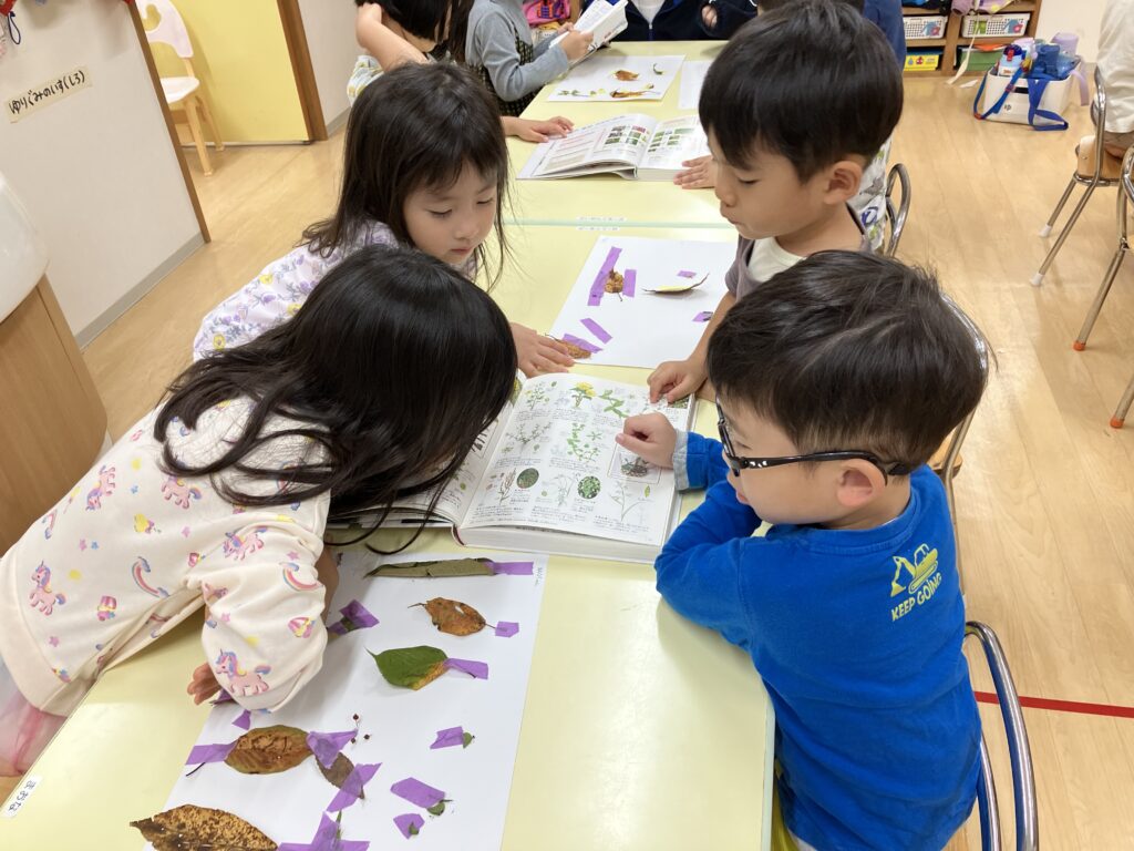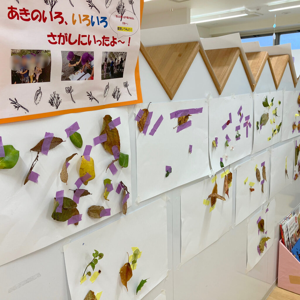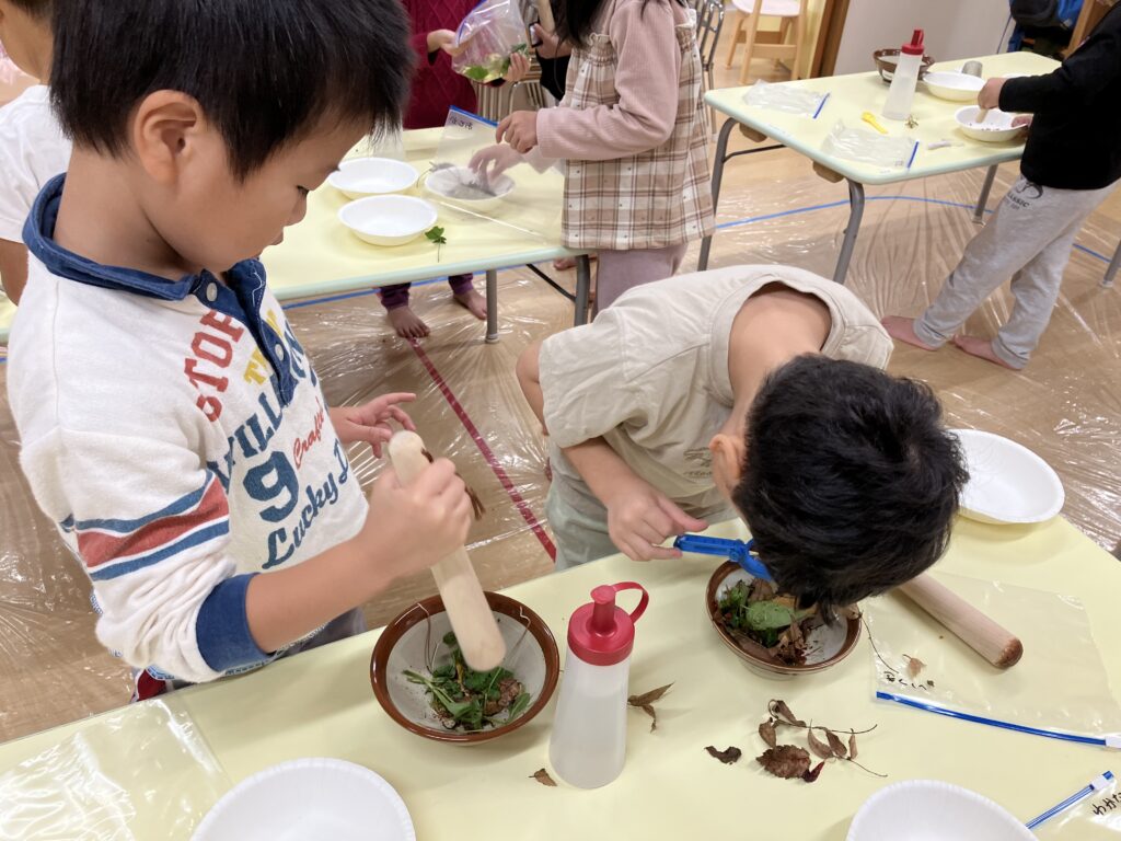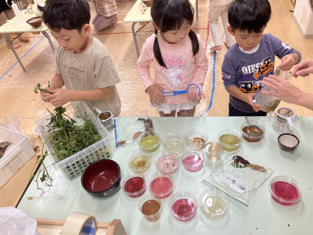 茶葉からのつながりで、普段触れる公園の葉っぱでも色が出るのかな?とみんなで公園にあるいろいろな葉っぱを集めに行きました。