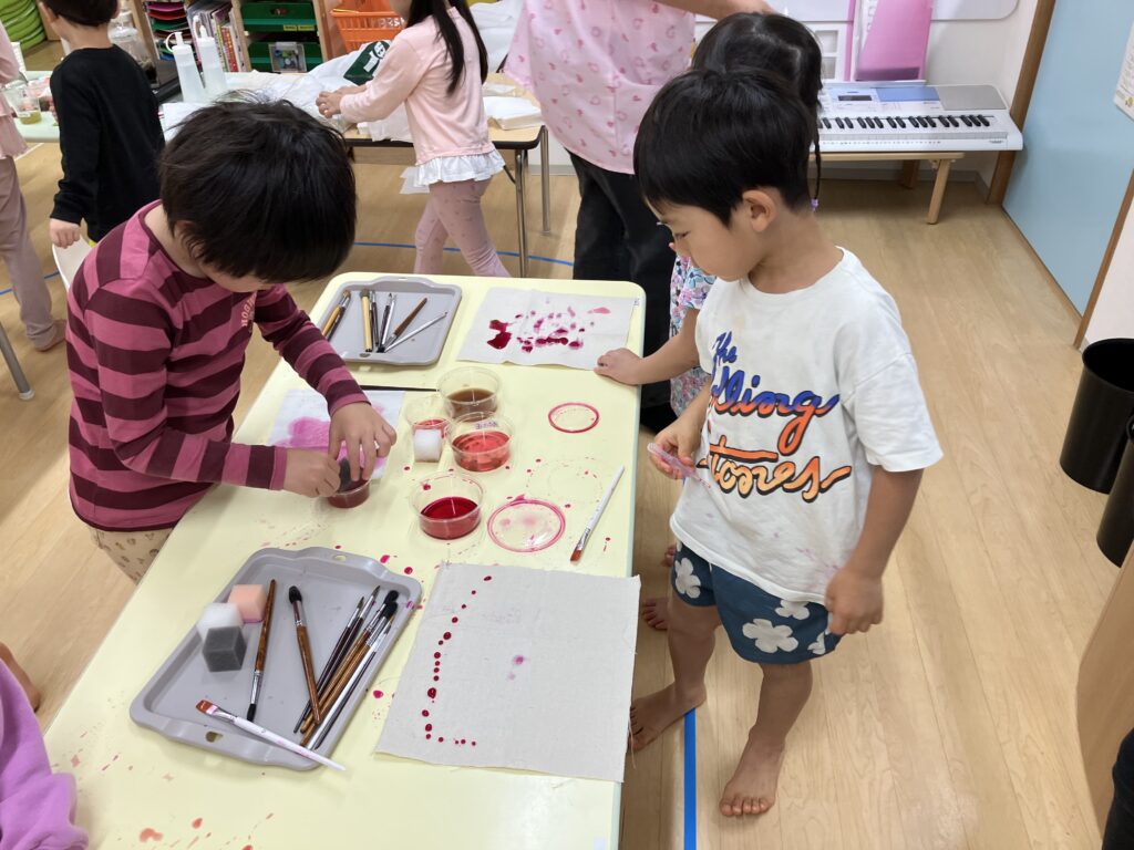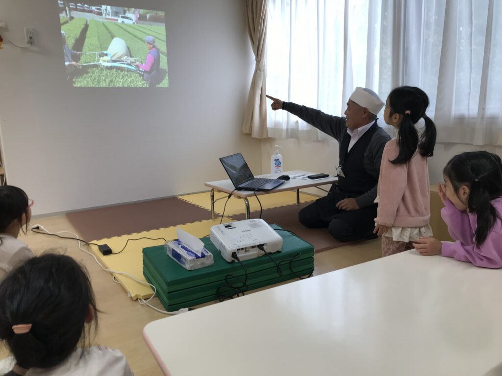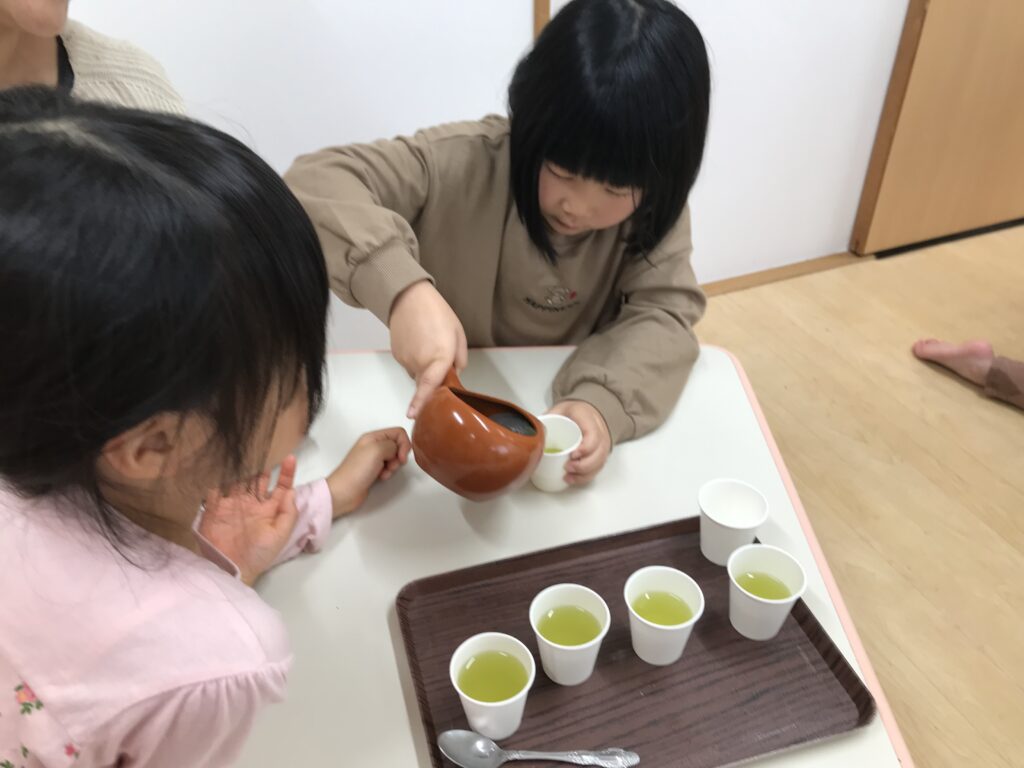 色水でお絵描きをしながら「いろんな色があるね」「いいにおいのお茶って何だろう?」と声が上がりました。そこで地域の茶工房の方に来てもらい、お茶の種類や作り方、お茶の入れ方を実際に教えてもらいました。