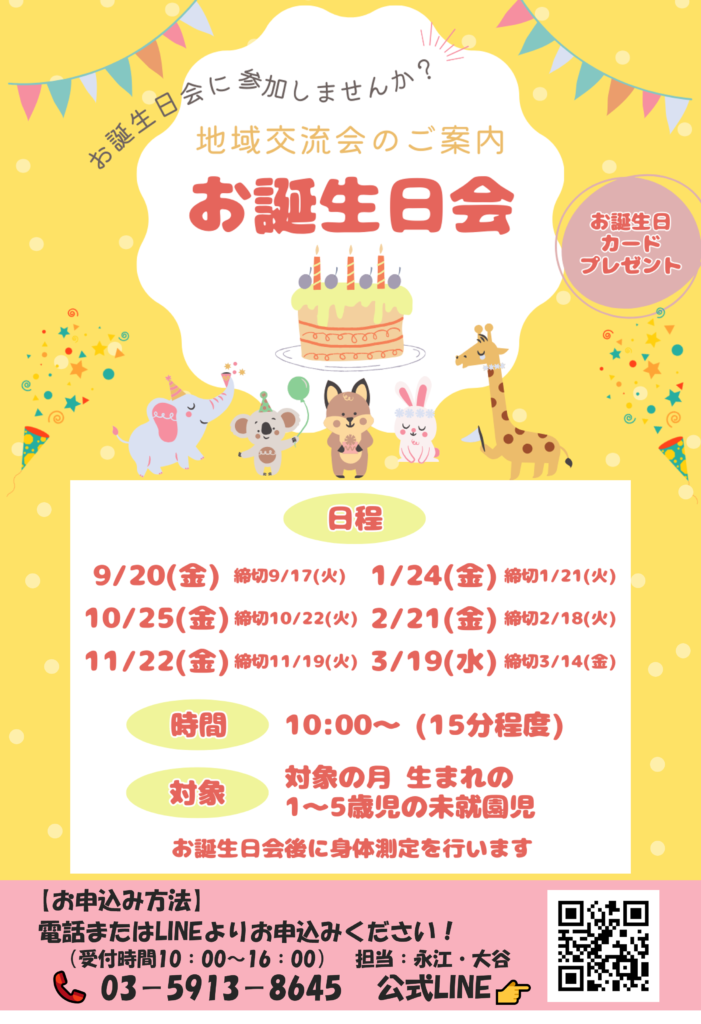【対象】対象の月生まれの1歳児~5歳児(就学前まで) 【締切】各日、開催日の3日前