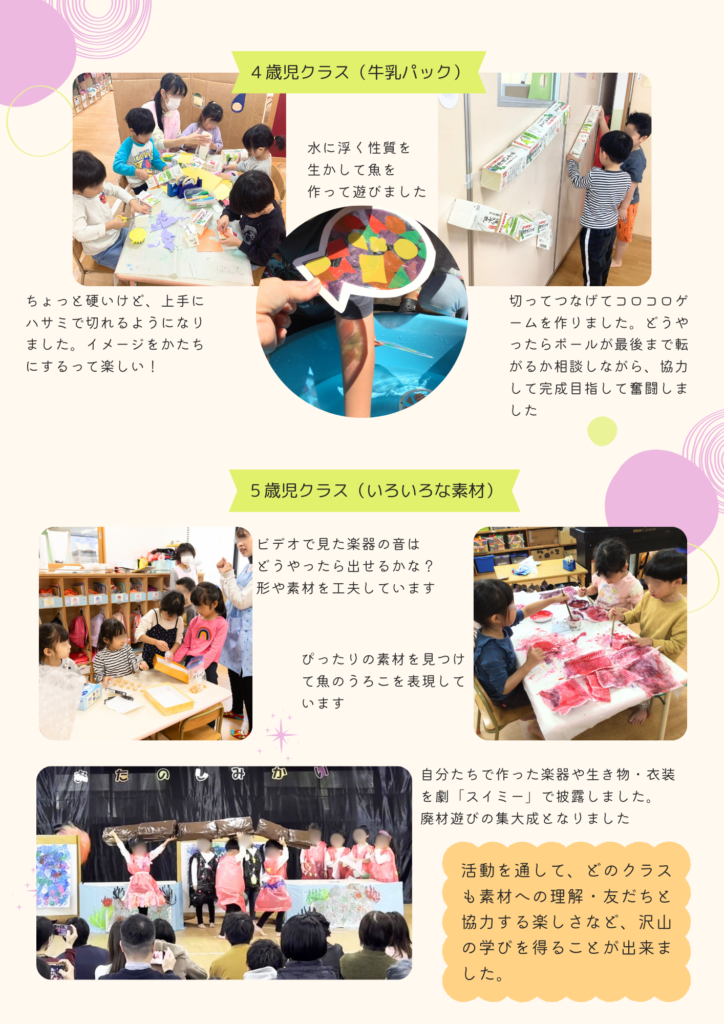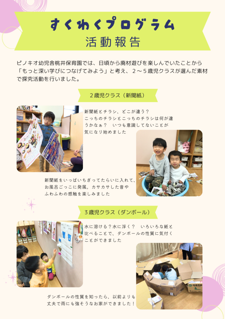 桃井保育園 2025.03.05 とうきょうすくわくプログラム活動報告 #桃井保育園 とうきょうすくわくプログラム 令和6年度 とうきょうすくわくプログラム推進事業に参加し、2~5歳児クラスが探究活動を行いました。生き生きとした子どもたちの活動の様子をご覧ください! 【桃井保育園】すくわく2歳児活動報告書ダウンロード 【桃井保育園】すくわく3歳児活動報告書ダウンロード 【桃井保育園】すくわく4歳児活動報告書ダウンロード 【桃井保育園】すくわく5歳児活動報告書ダウンロード