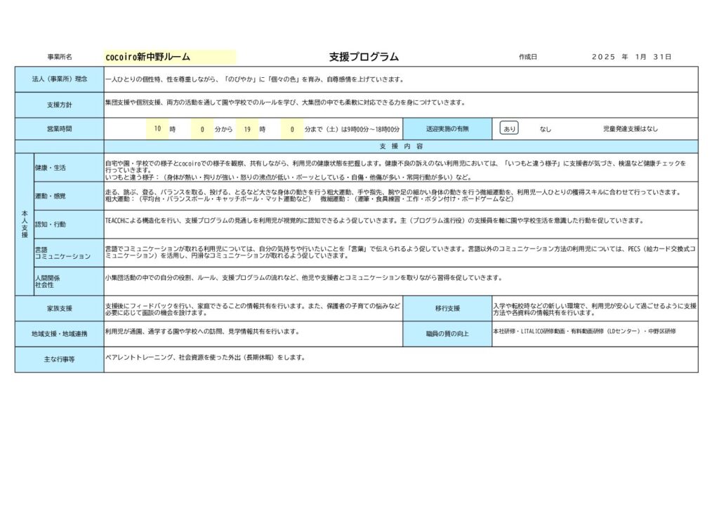 cocoiro新中野ルームの支援プログラムは下記の通り実施しております。