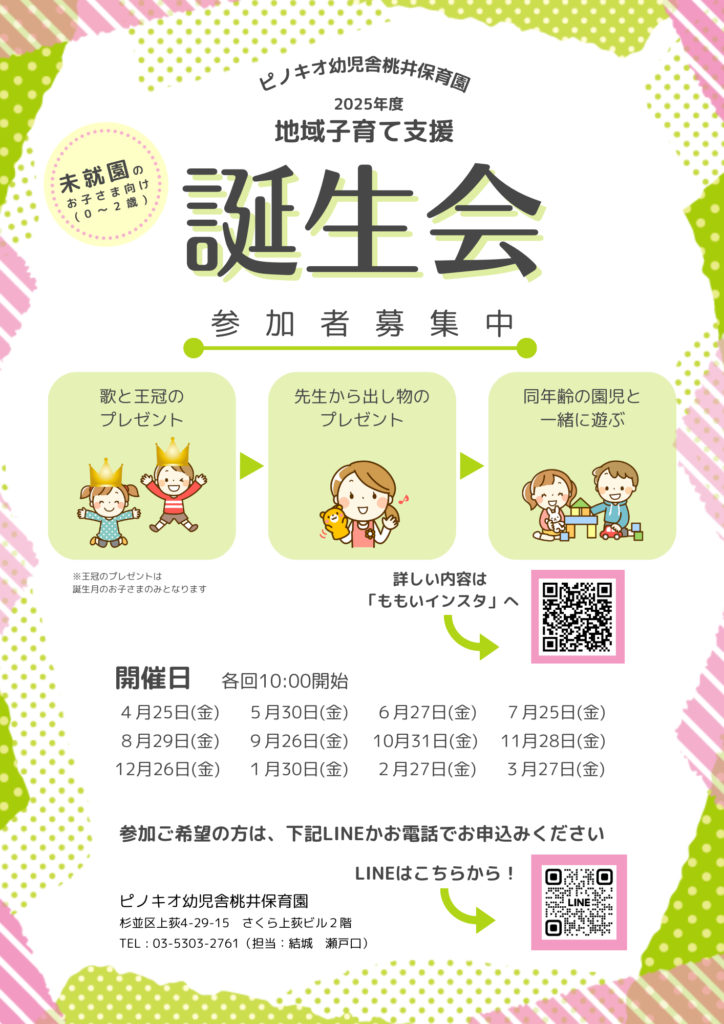 桃井保育園 2025.03.25 誕生会のご案内 #桃井保育園 地域交流子育て支援 今年度は、誕生会の後に園児と一緒に遊ぶ時間を設けました。お子さまと園児の関わりを見守りながら、保育士に育児の質問ができます。日ごろ気になっていること、話してみませんか?ご参加お待ちしています!! 地域子育て支援カレンダー(A4)ダウンロード お申し込みはこちら(LINE)詳しい内容はこちらをCHECK!(Instagram)