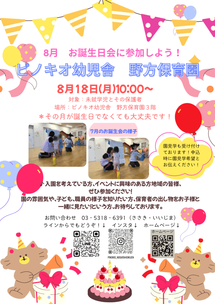 野方保育園 2025.08.04 8月 お誕生日会に参加しよう! 地域交流行事・イベント Lineはこちら 行事参加・園見学の予約を受け付けております。お電話での予約も可能です。 Instagramはこちら