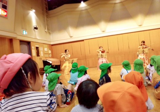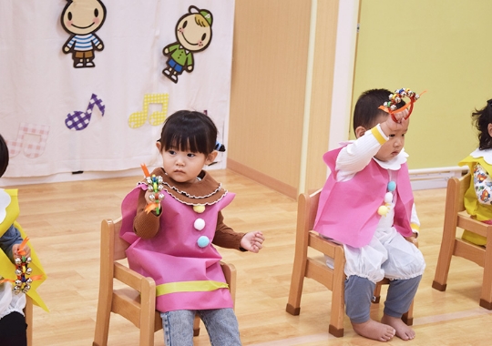音楽やリズムとの対話を楽しみ、自己表現の喜びや心地よさを大切に、心と体のバランスがとれた豊かな人間性を育みます。(月1回 1~5歳児クラス)