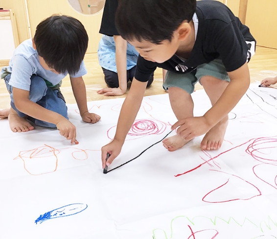 様々な素材や道具に触れ、感触や色、形の違いを知り、興味をひきだしながら、豊かな感性による表現を楽しみます。(月1回 3~5歳児クラス)