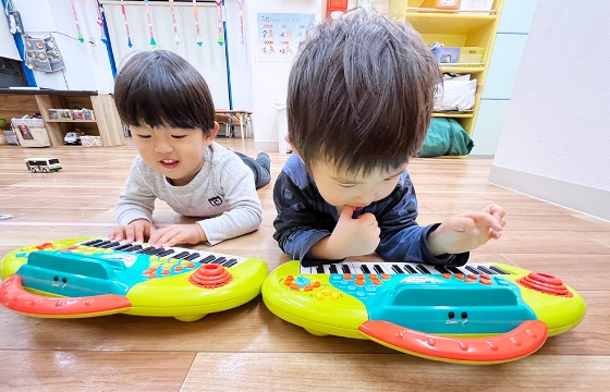 月2回講師が来ます。日頃からピアノや鈴等様々な楽器に触れ、音の違いを感じたり、リズムに合わせて体を動かして楽しんでいます。