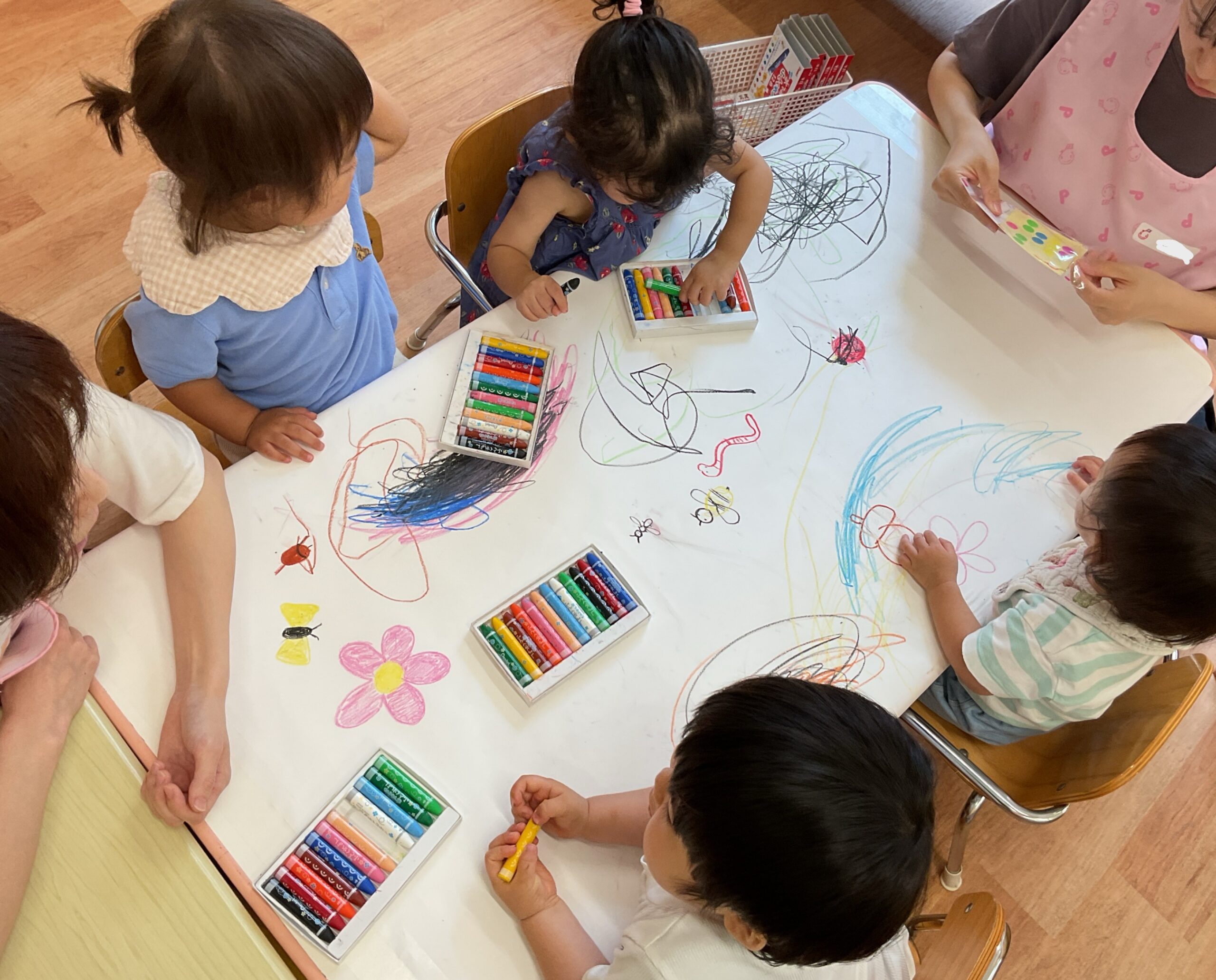 様々な素材を使ったり、大きな紙をダイナミックに使って絵を書いたりと子どもの表現力や発想力を養っています。
