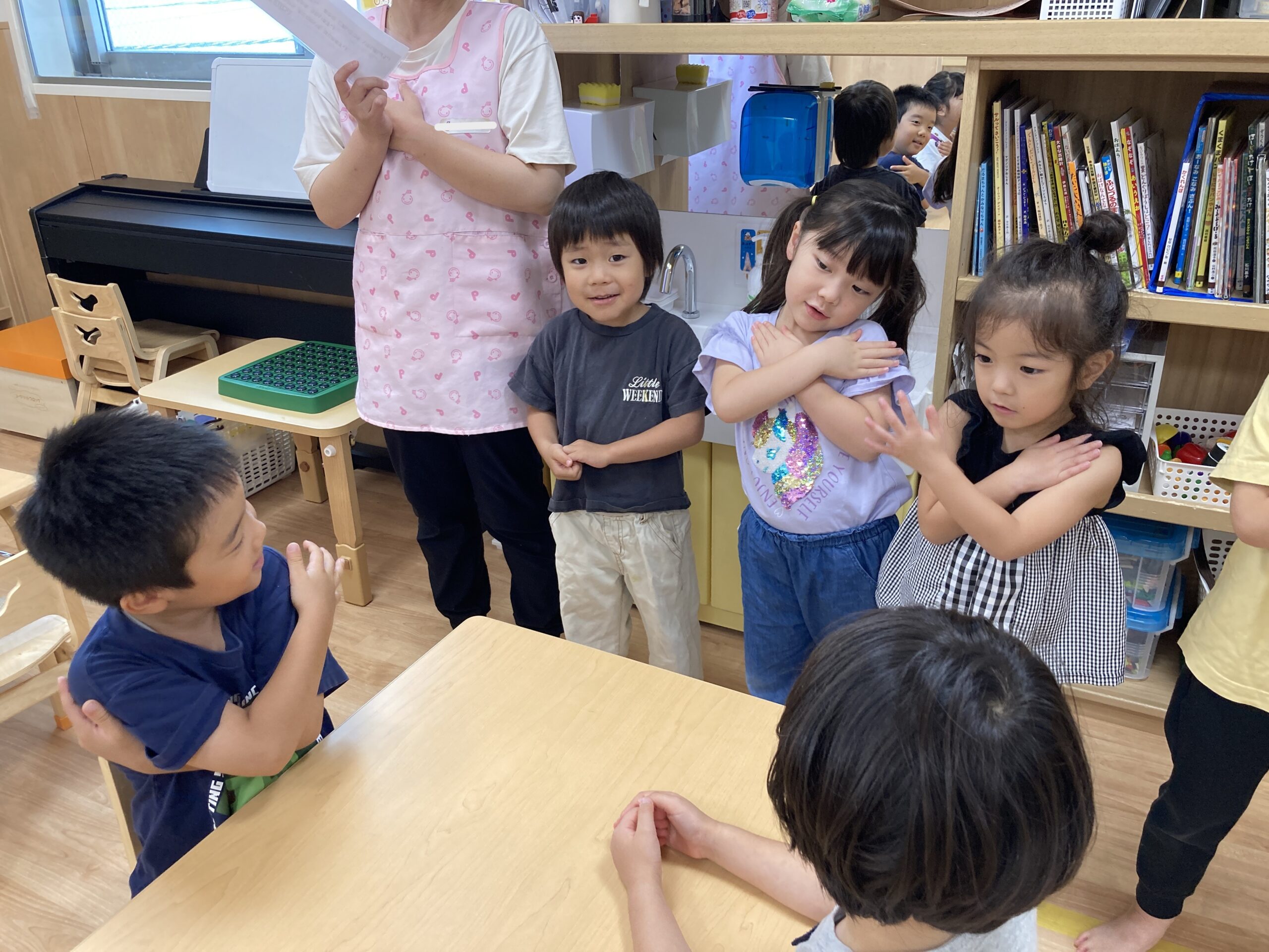 手洗い指導や鼻かみ指導、咳エチケットの保健指導を行ったり、プライベートゾーンの話も絵本を用いて行い、自分やお友達の身体は大切にすることを伝えています。