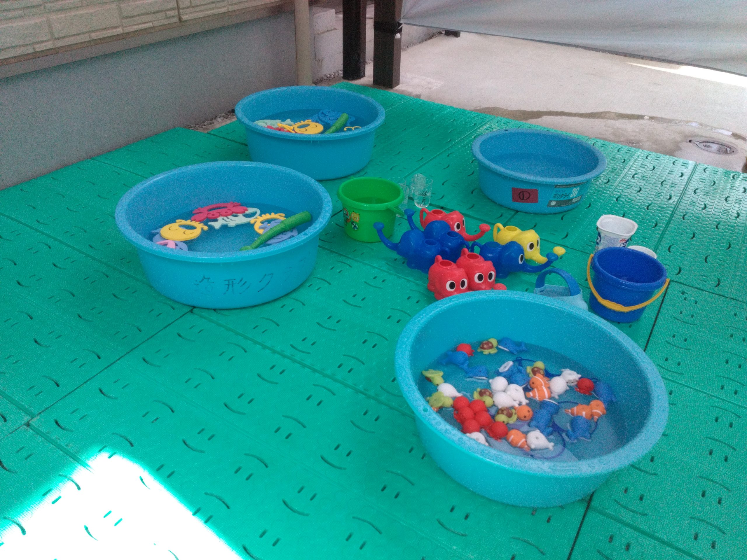 気温が高い日(6月下旬~9月ごろ)は、保護者用の駐輪場または、園の玄関前にマットを敷き、水遊びをしています。 -