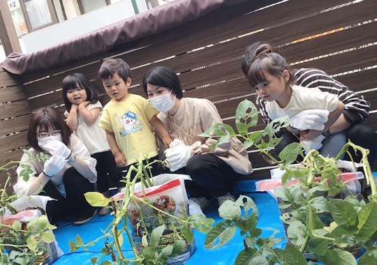 テラスでじゃがいも栽培にチャレンジ!子どもたちとお世話をしながら毎日成長を見守っています。収穫は親子で一緒に体験します。