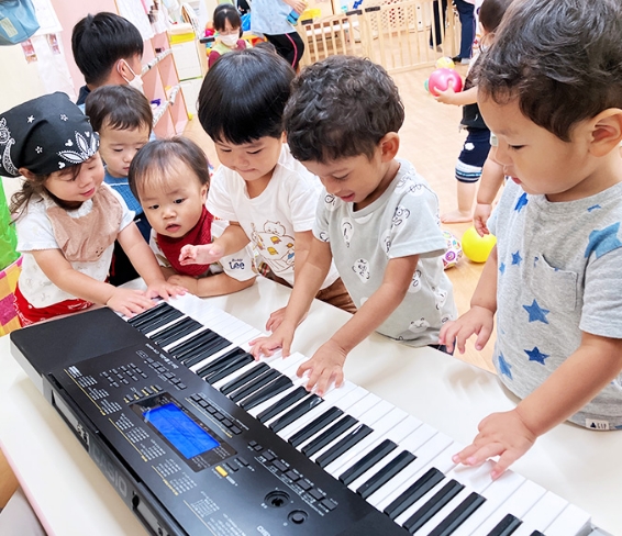 【1,2歳児】子どもたちは講師の先生が大好き!楽器に触れてたり、ピアノに合わせて沢山身体を動かして楽しんでいます。