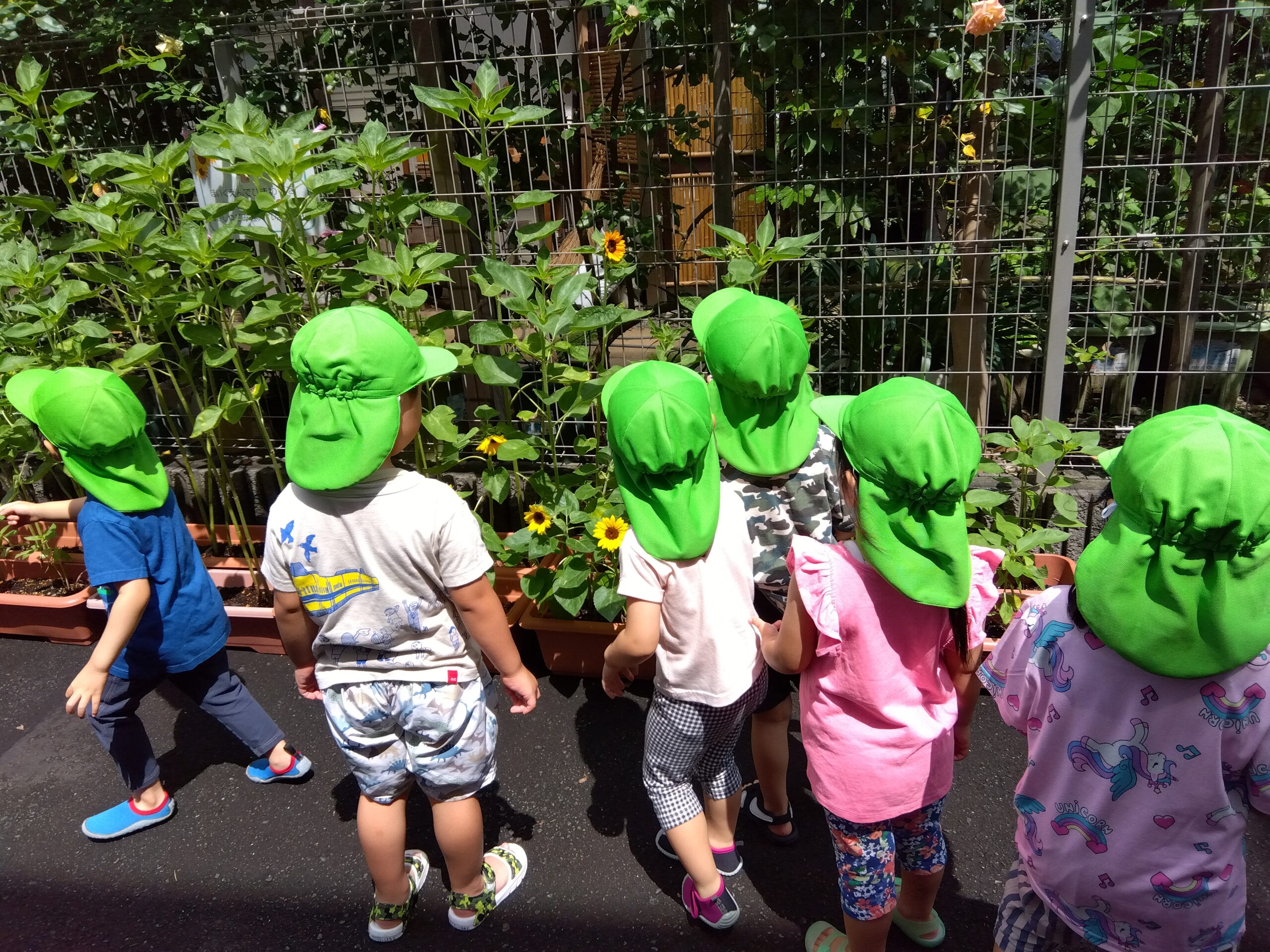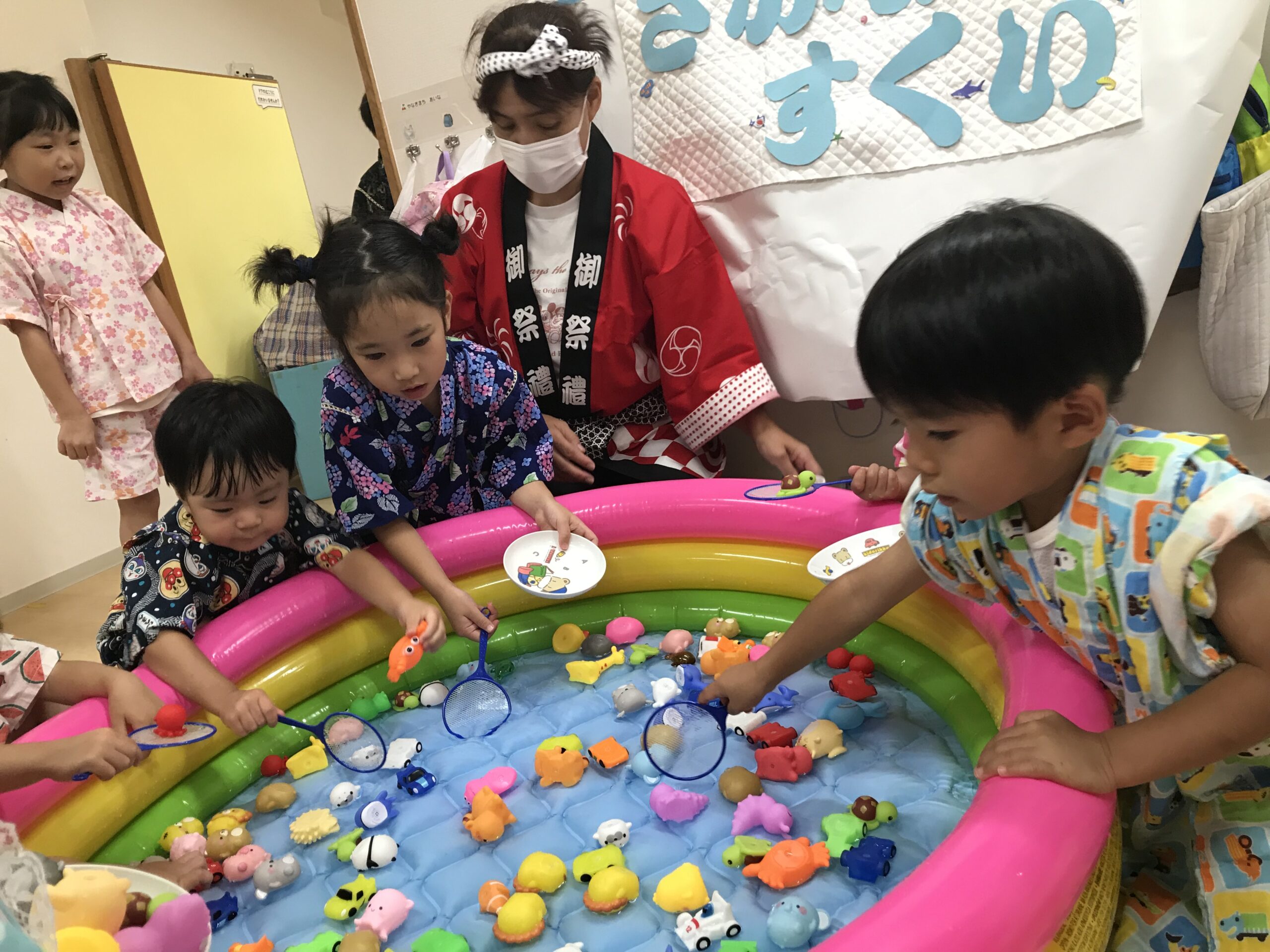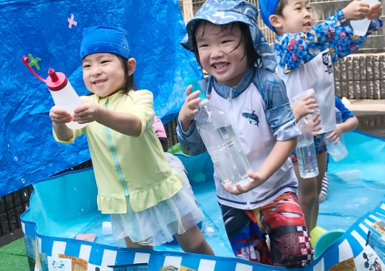 • お天気の良い日は毎日お散歩に出かけます。夏にはビル裏にプールを出して水遊びを行っています。0、1歳児は室内で水遊びを行います。