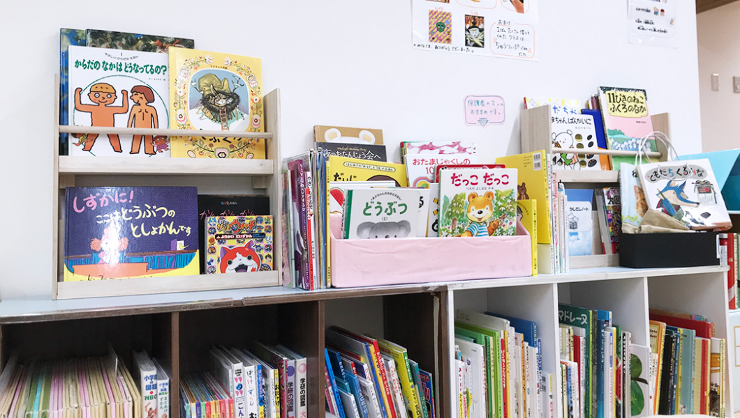 おはなしの日には、園全体で同じ時間に静かな環境の中、絵本や紙芝居を楽しんでいます。絵本コーナーは親子でじっくりと絵本を選んで、貸出OKです。