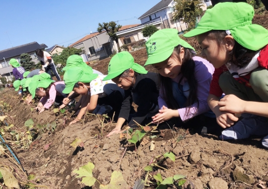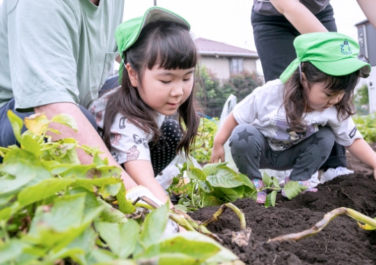 20分の電車移動はミニ遠足。農園へじゃがいもやさつまいもを掘りにいきます。自分たちで収穫した野菜は、自分たちで調理して食べます。特別な味に舌鼓です!