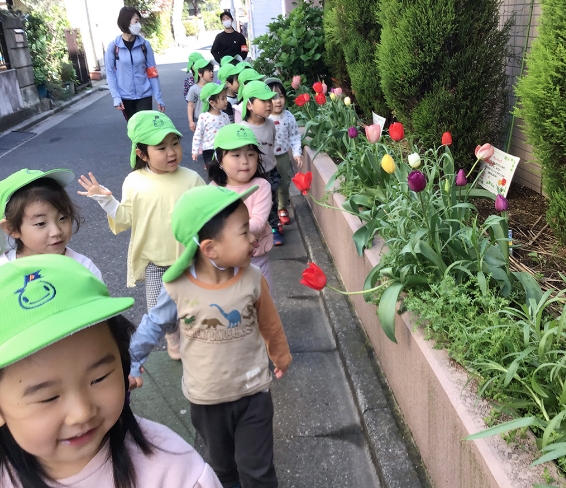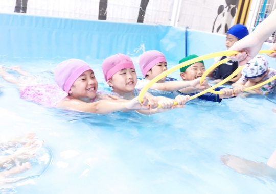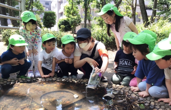 近隣には、四季を感じる自然豊かな公園がありますので、天気の良い日は公園に行き、自然に触れたり、体をたくさん動かして遊んでいます。夏はテラスにプールを設置し、プール遊びが楽しめます。また、学童保育も併設していますので、小学生と定期的に交流をもち、読み聞かせやドッジボールなどを行っています。