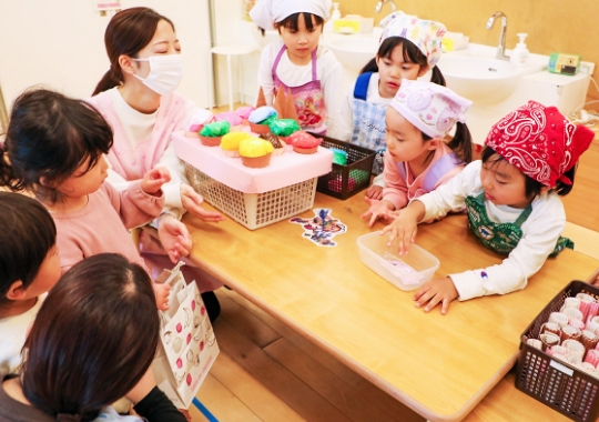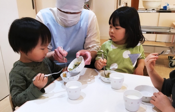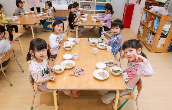 • 本部に管理栄養士がおり、楽しく美味しく食べられるように工夫した献立を考えています。給食、おやつは園で調理しています。離乳食は中期から提供しています。また、食物アレルギーに対しても対応しています。