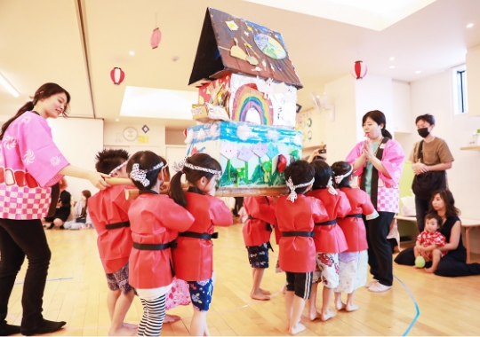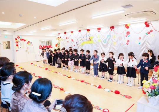 • 入園式(4月新入園児)・じゃが芋ほり(6月幼児のみ)・夏祭り(7月)・運動会(10月)・生活発表会(2月)・卒園式(3月5歳児)・保護者会(年2回)・個人面談(年2回)・保育参観(年1回)・運営委員会(年2回)
