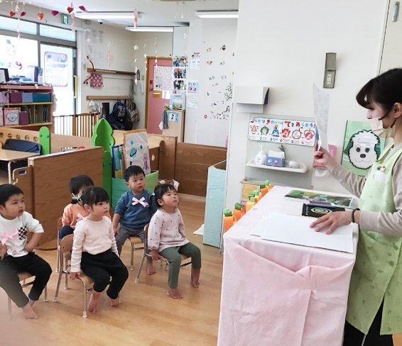 2歳児を中心に、食べる食材がどんな力になるのかを確認しながら行っています。子どもたちはすぐに覚えて「これは○○だよね」と言って給食の時間を楽しんでいます。