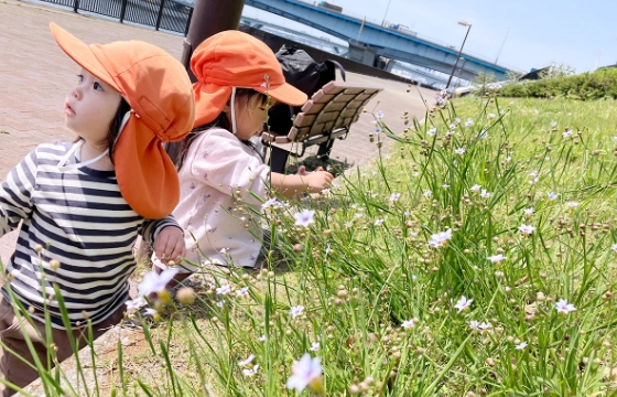 園周辺には高層ビルや運河だけでなく、下町情緒あふれる「もんじゃストリート」の街並みもあり、戸外活動では目的にあわせていろいろな環境で遊ぶことができます。室内活動では、先生たちの創意工夫によるダイナミックな製作や広いスペースでの運動遊びなども行っています。栽培を通した食育活動など、子どもたちと様々な経験をしています。