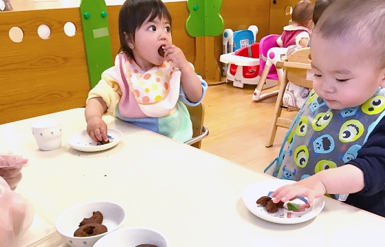 みんな楽しみおやつの時間です♪0歳児さんも、手作りおやつ(離乳食)や、授乳の時間です。