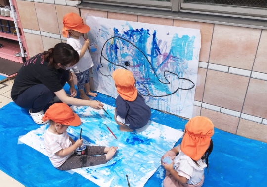 造形講師による、絵の具や廃材、シールなどを用いた製作活動を子ども達と一緒に行います。(※主に1,2歳児)