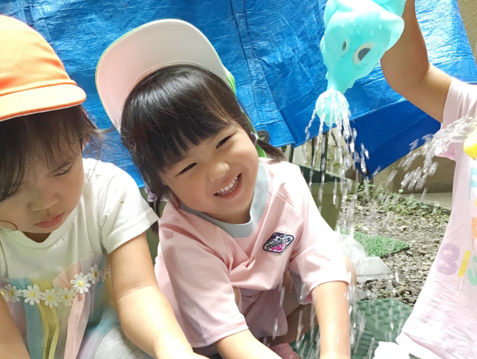 スペースの関係上プール遊びは行っていませんが、たらいに水を入れた水遊びを行っています。近年気温が高い日が続いておりますので、その日の状況に応じて対応しております。