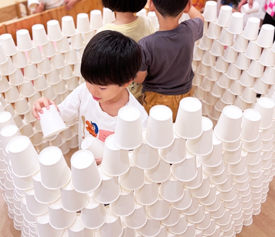 空き箱、トイレットペーパーの芯などを再利用して、子ども自身で遊びを見つける環境を提供しています。