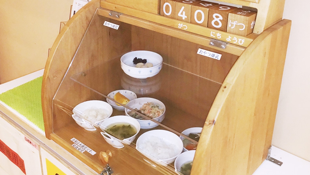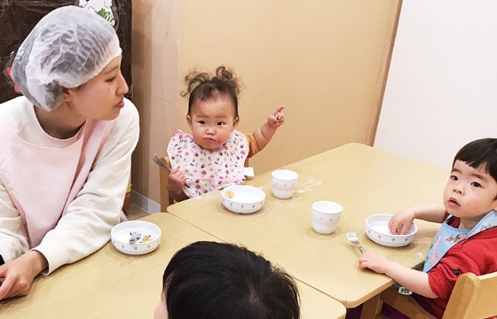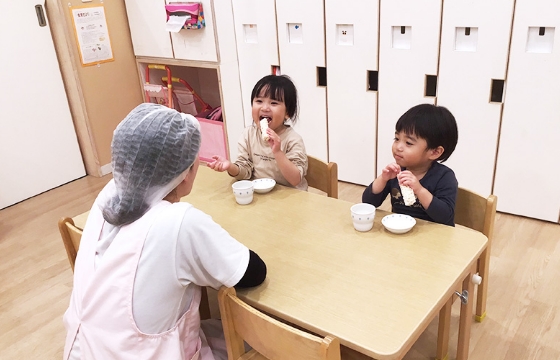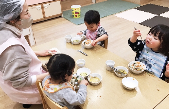 本社に管理栄養士がおり、楽しく美味しく食べられるように工夫した献立を考えています。給食・おやつは園の調理室で手作りしています。離乳食は初期(ゴックン期)からの提供が可能ですが、新しい食材はご家庭で2回以上試して頂くようお願いしております。